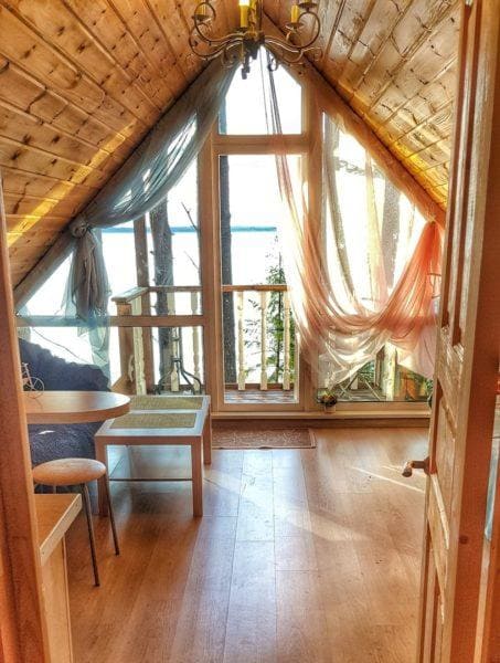 - Второй этаж: номер с отдельным входом, панорамным окном и потрясающим видом на озеро.